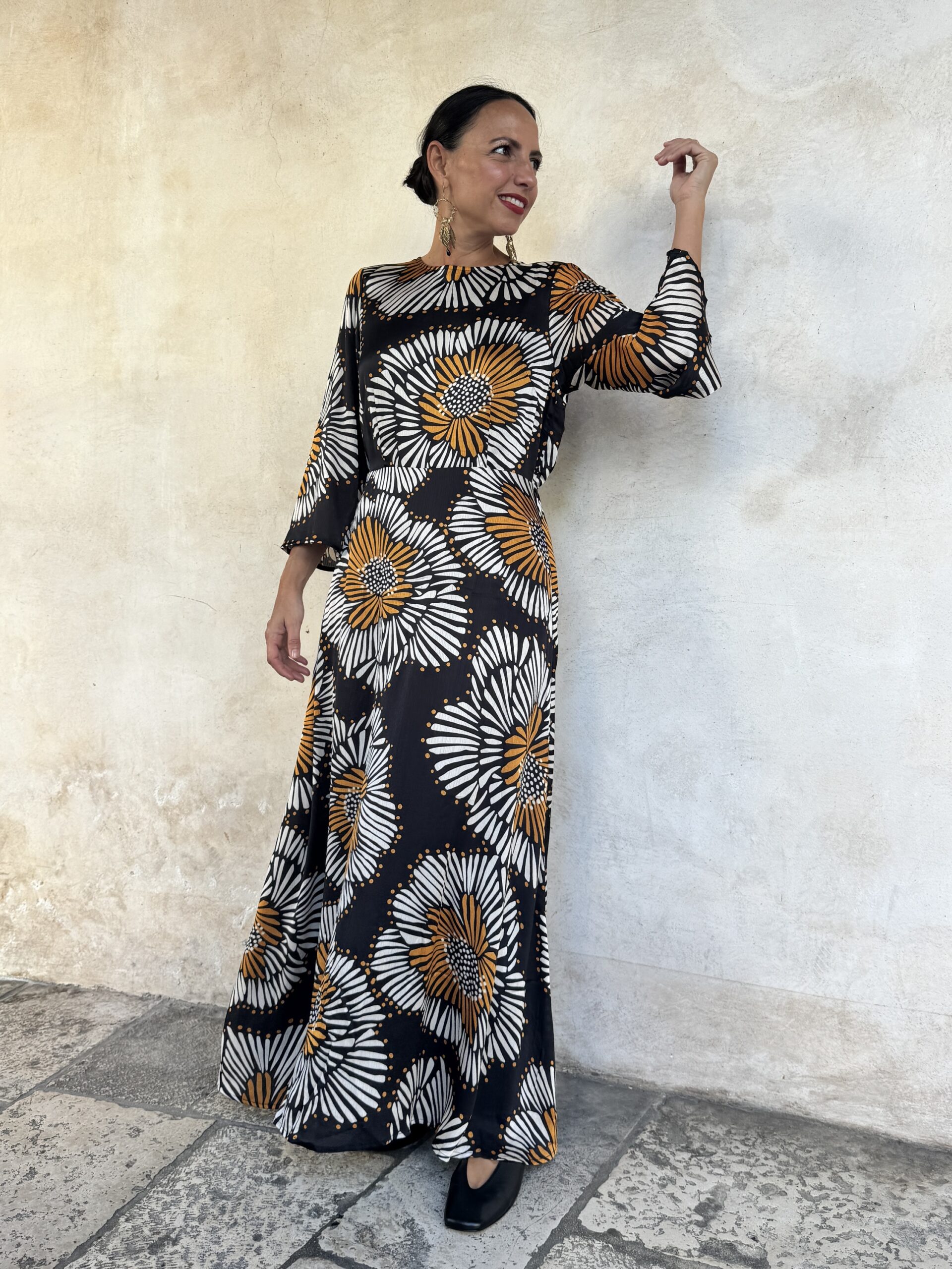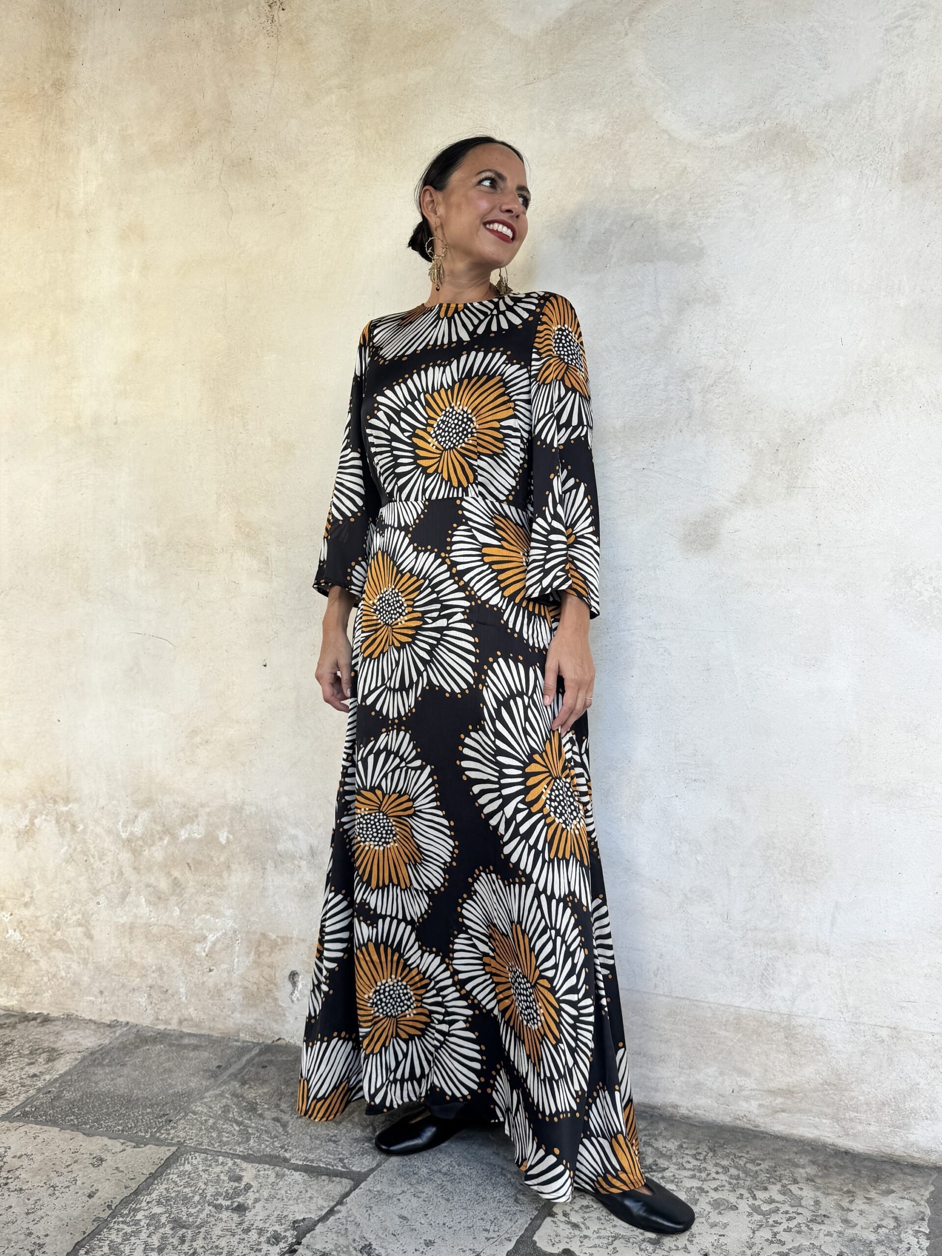 – Abito lungo in tessuto fluido stampato.