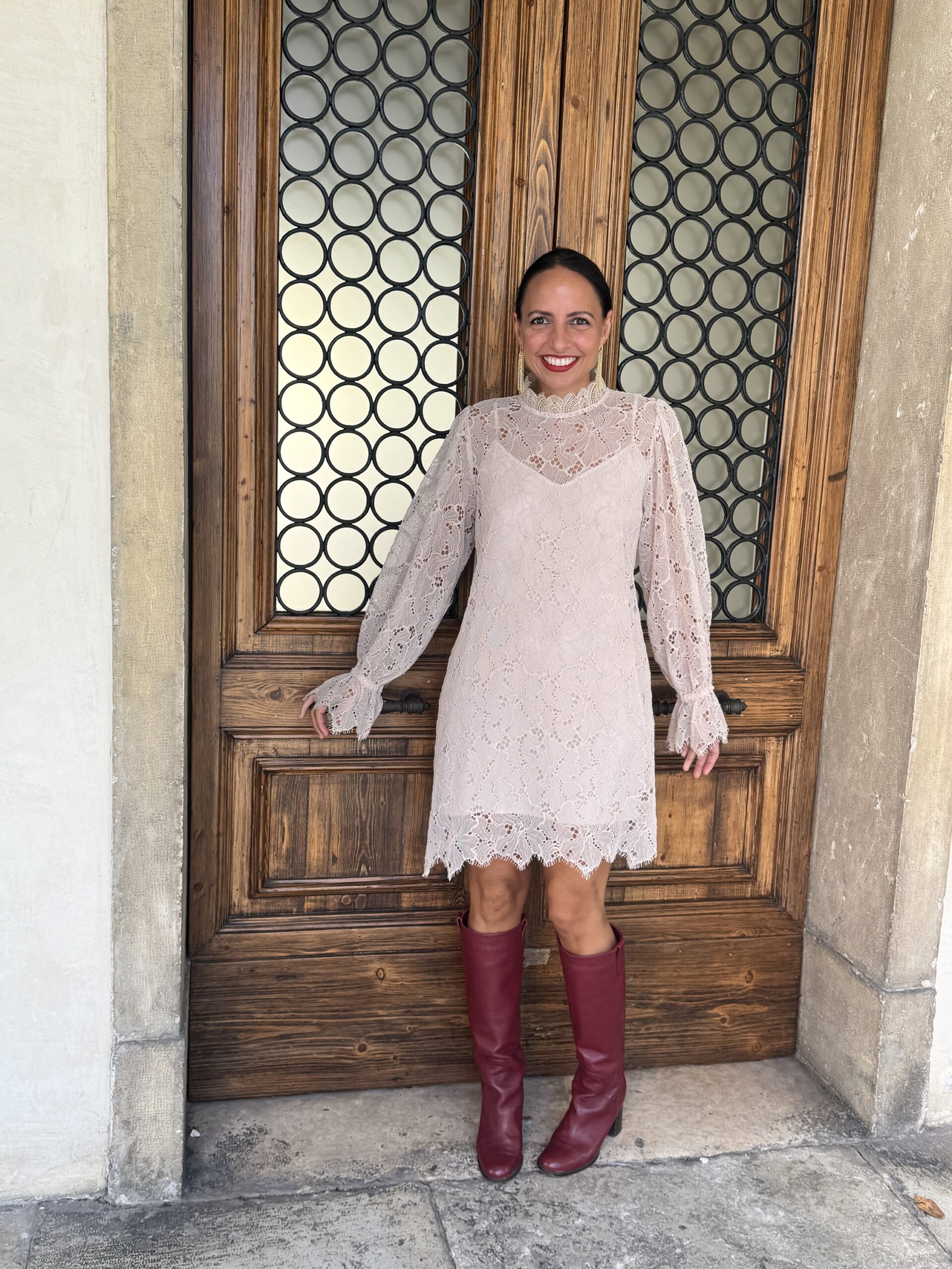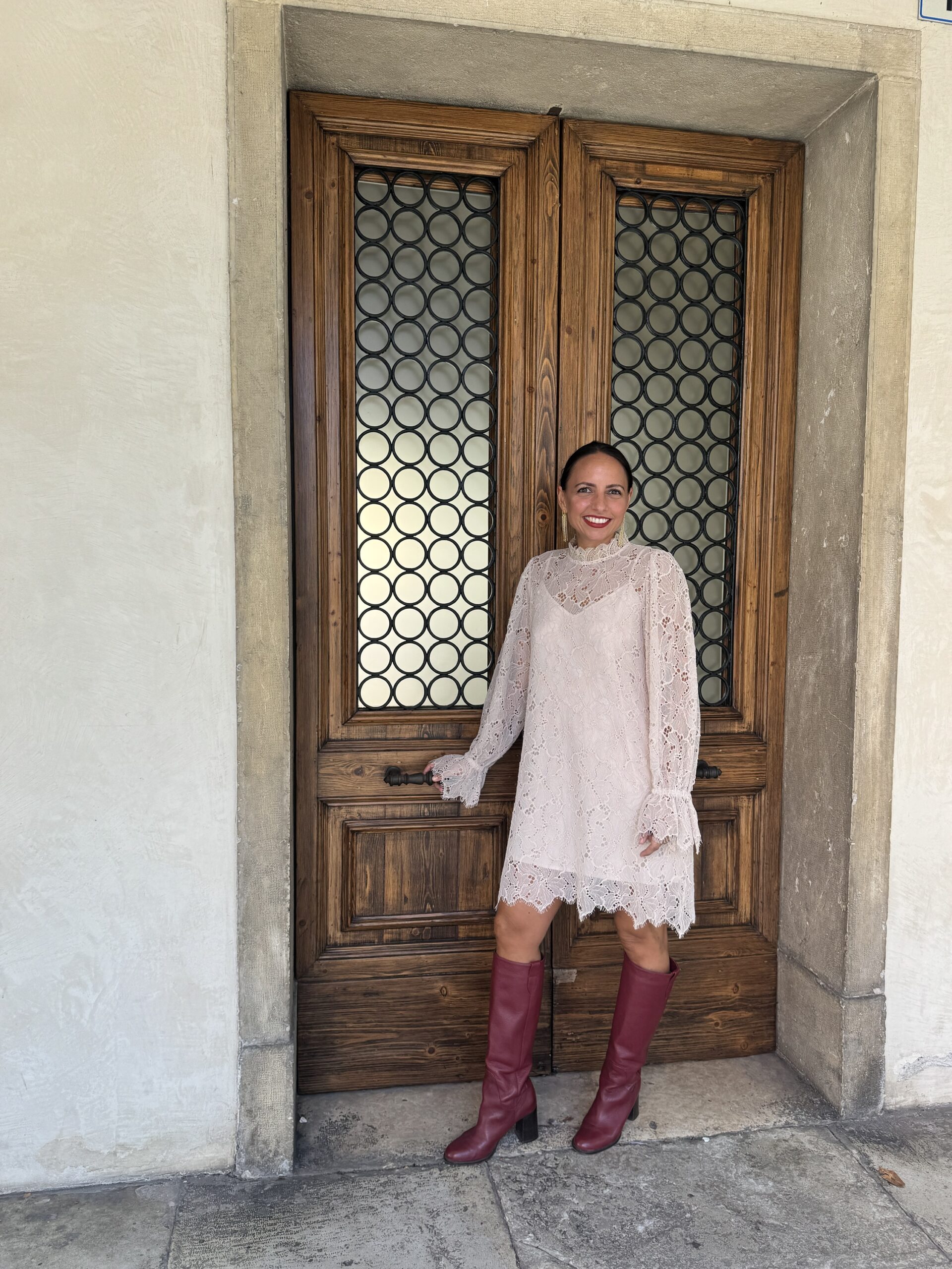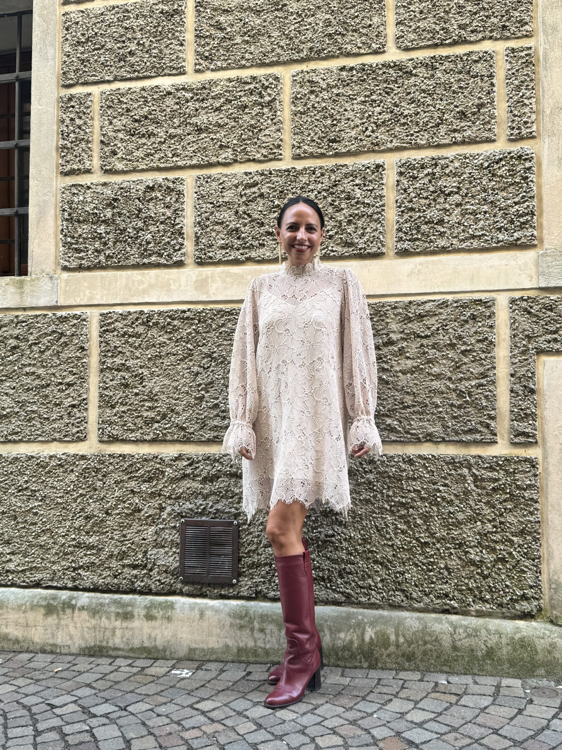 – Maddalena è alta cm 164 e di solito indossa una tg 40/s. Nella foto indossa una S.