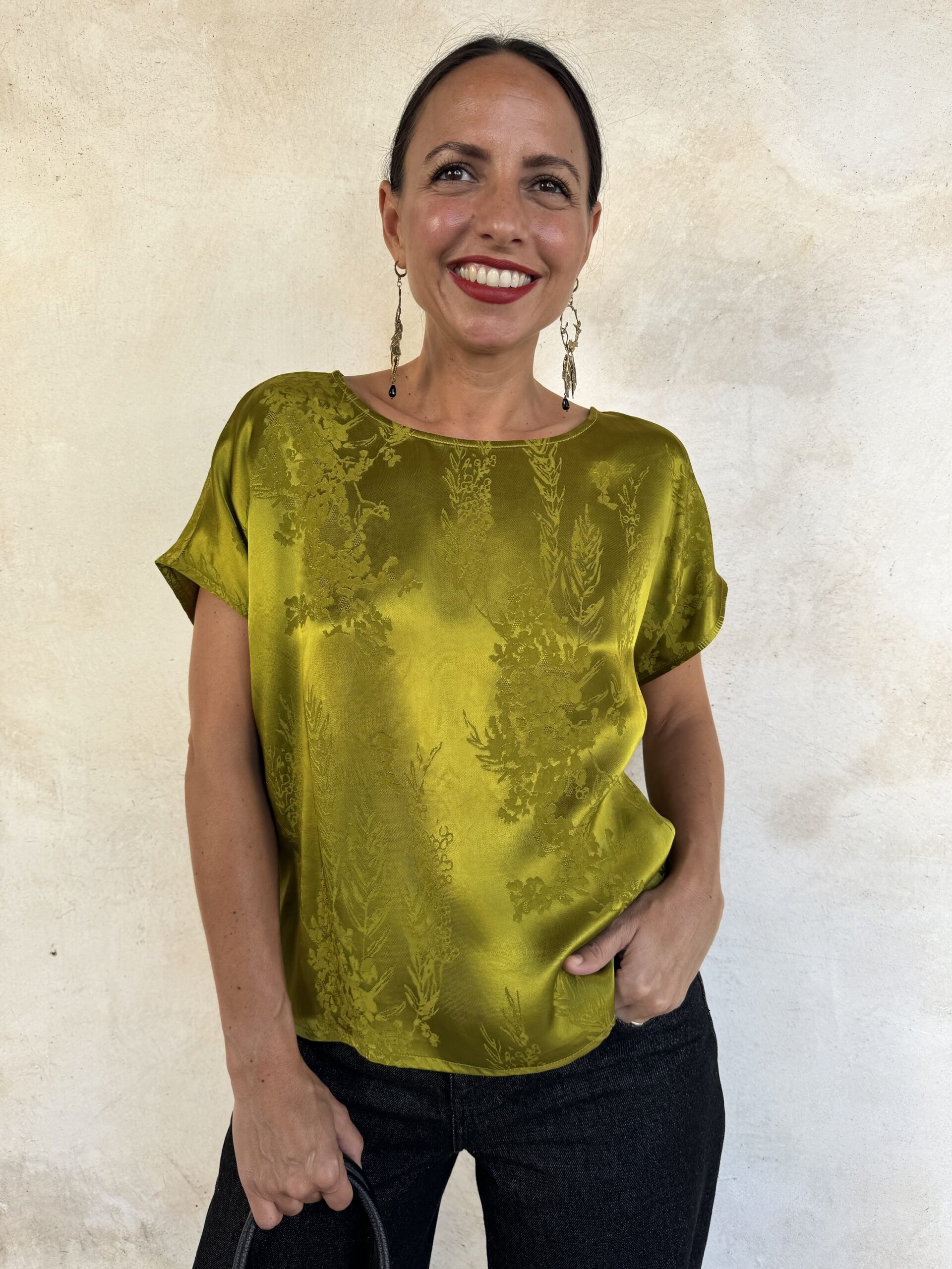 – Blusa in tessuto lucido con disegno a fiori in trama.