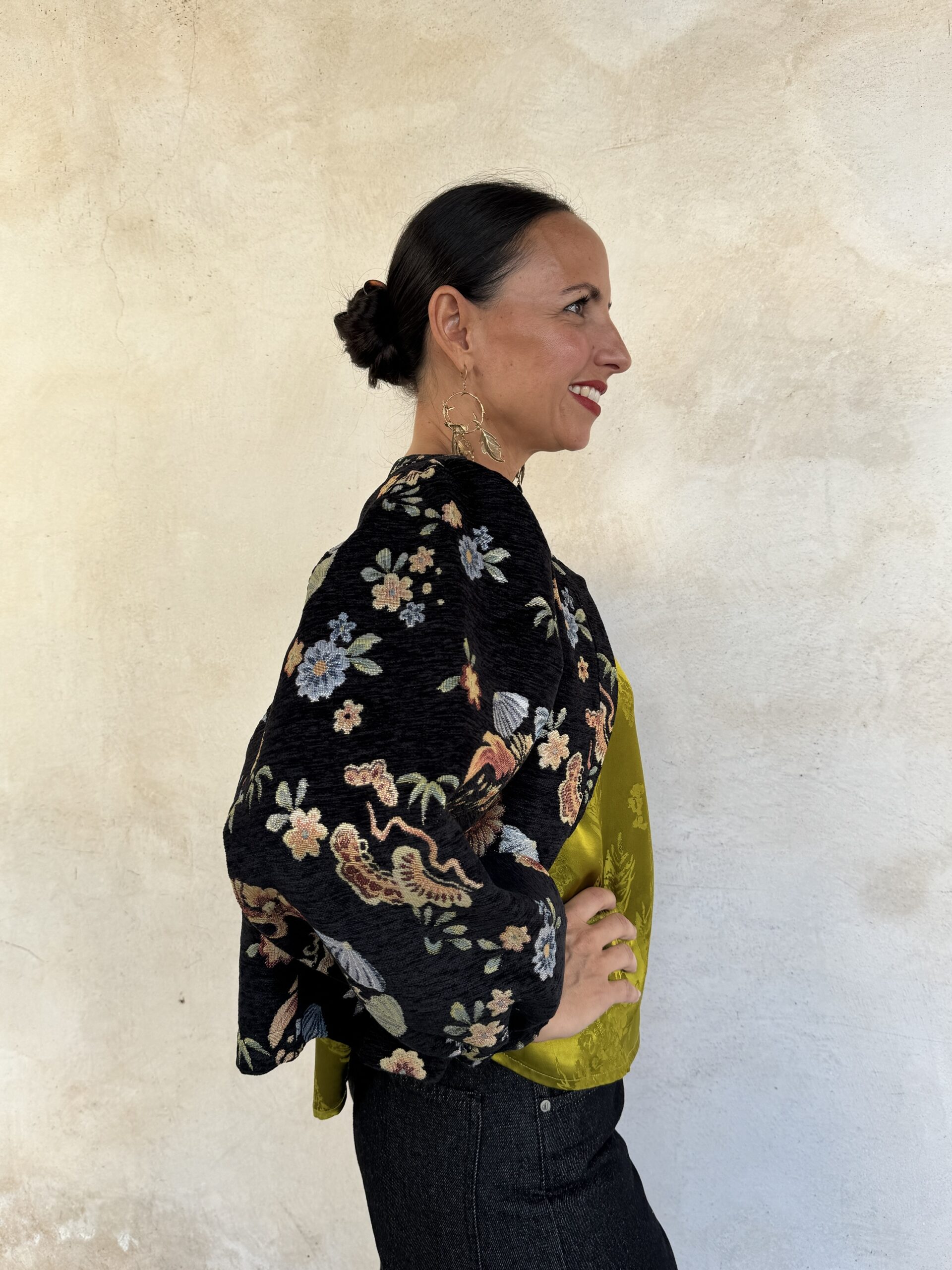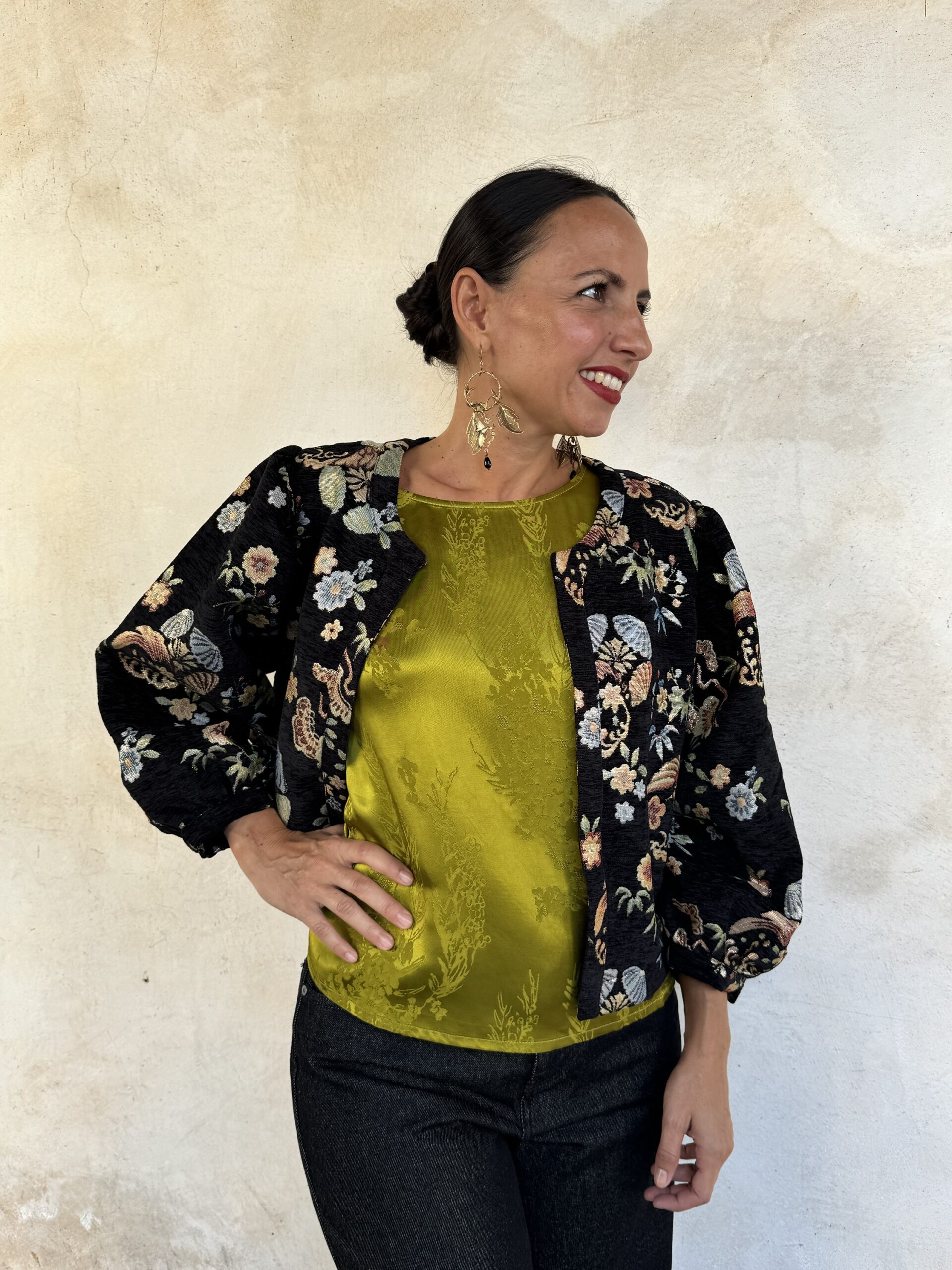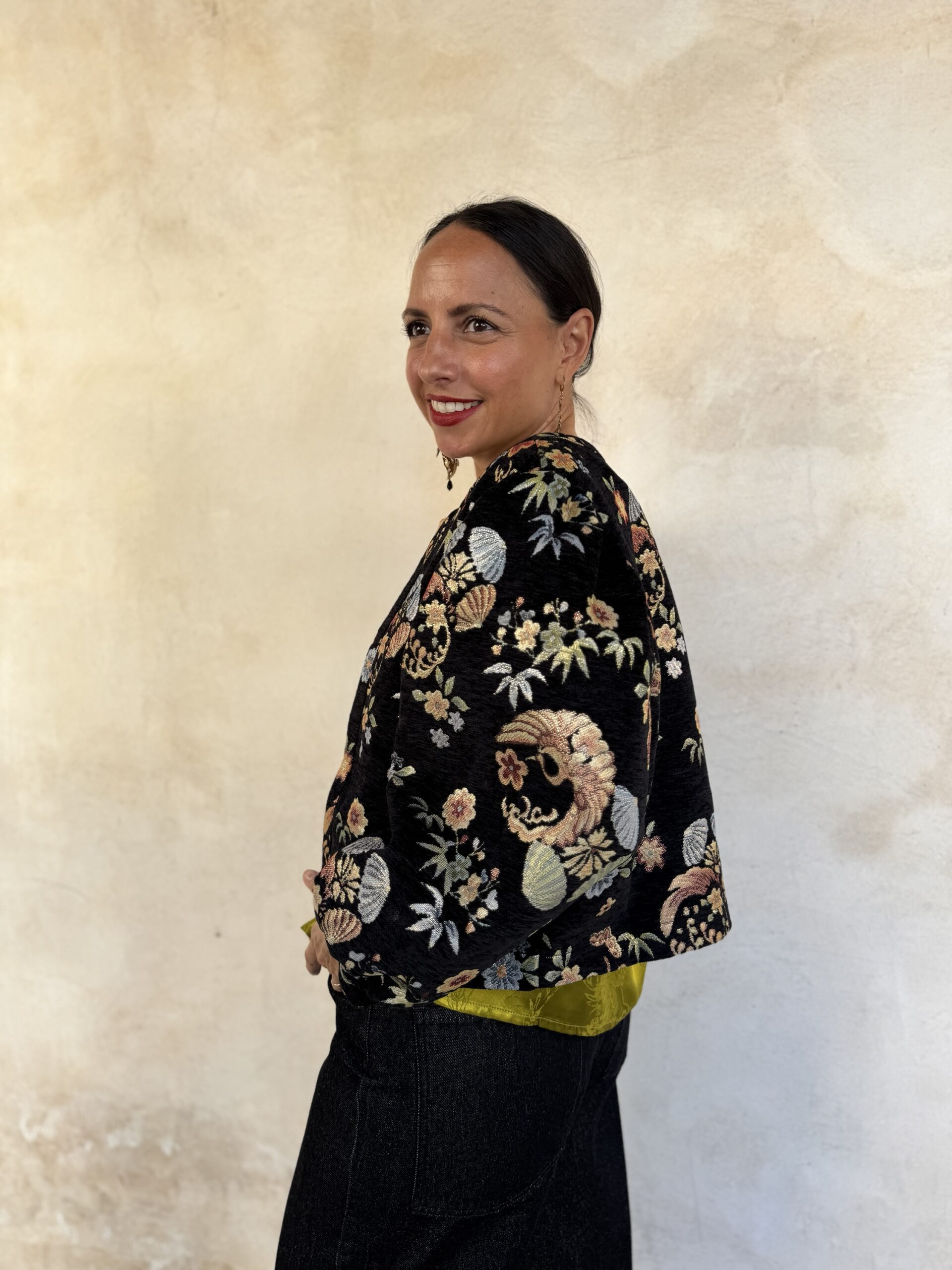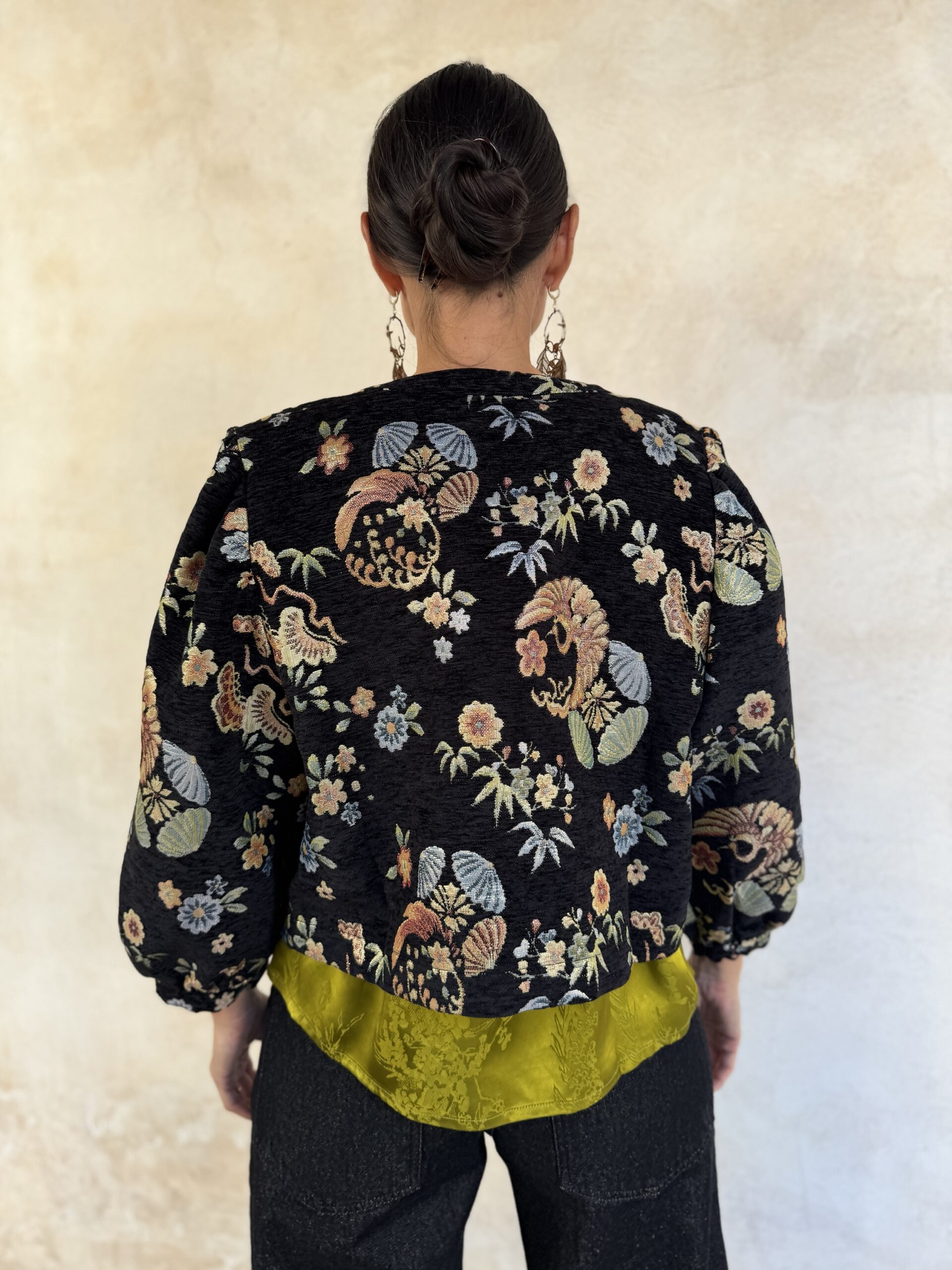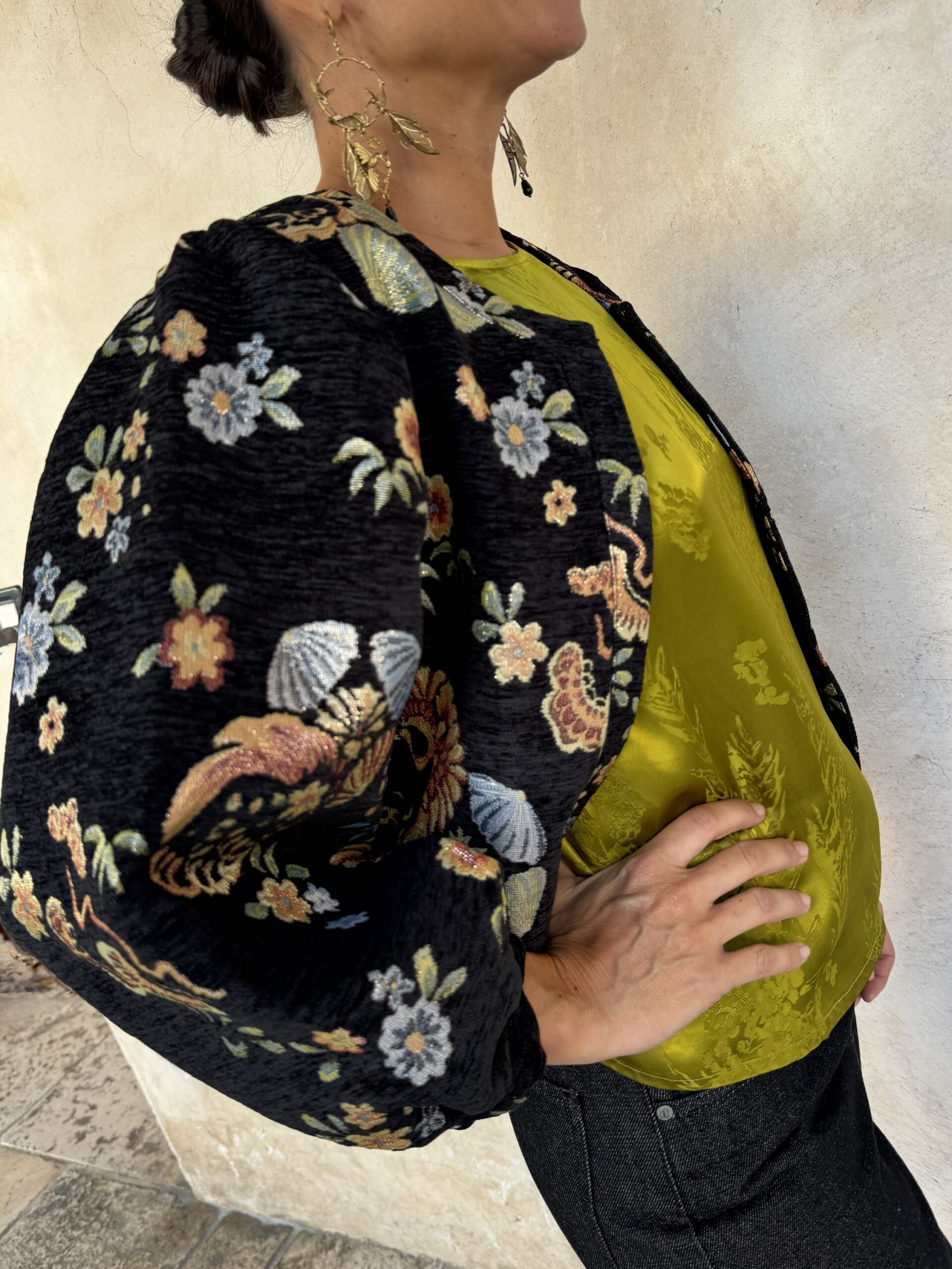 – Giacca corta a Bolerino in tessuto damascato con fiori brillanti in trama.