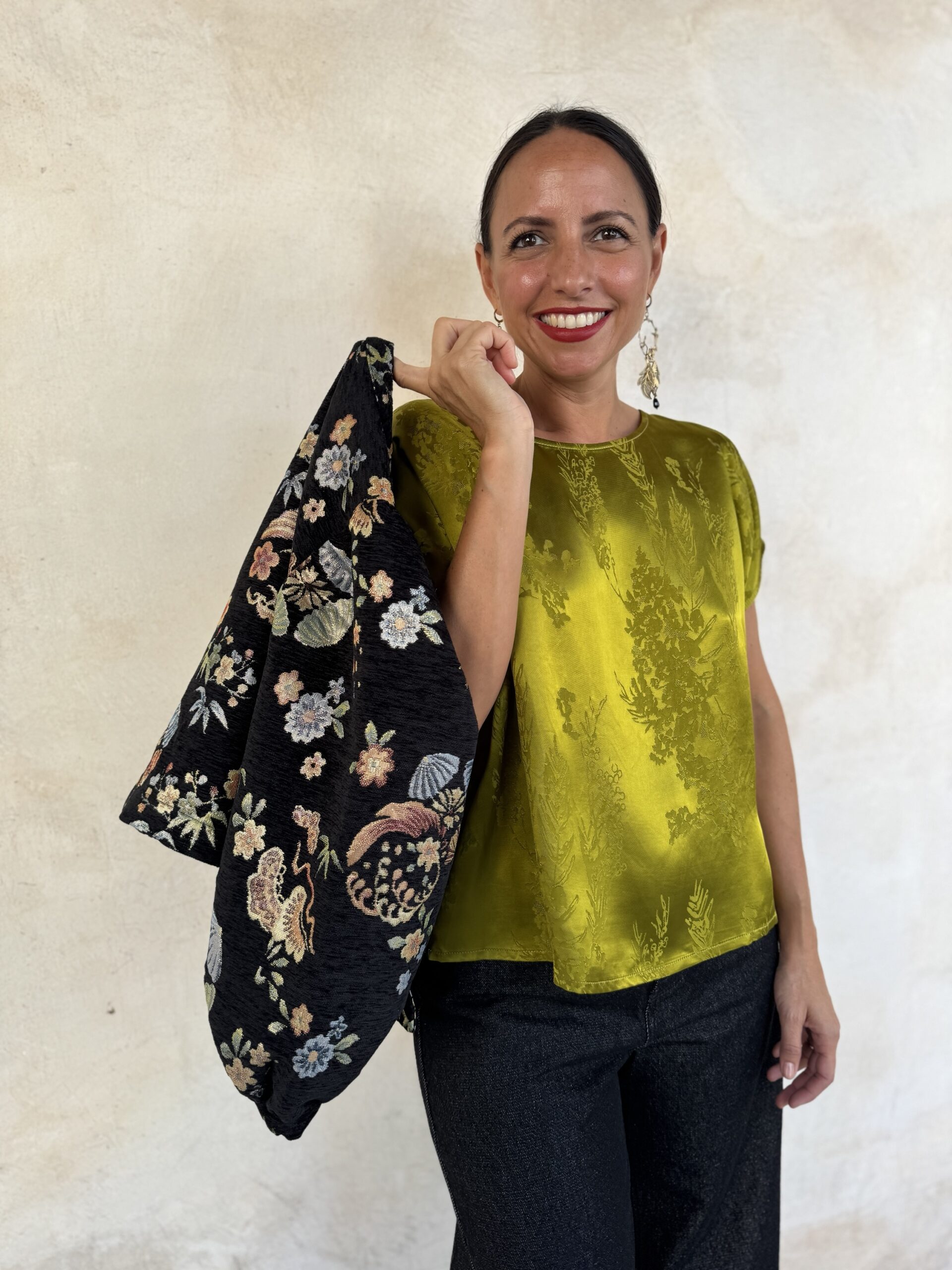 – Maddalena è alta cm 164 e di solito indossa una tg 40/S. Nella foto indossa una M.