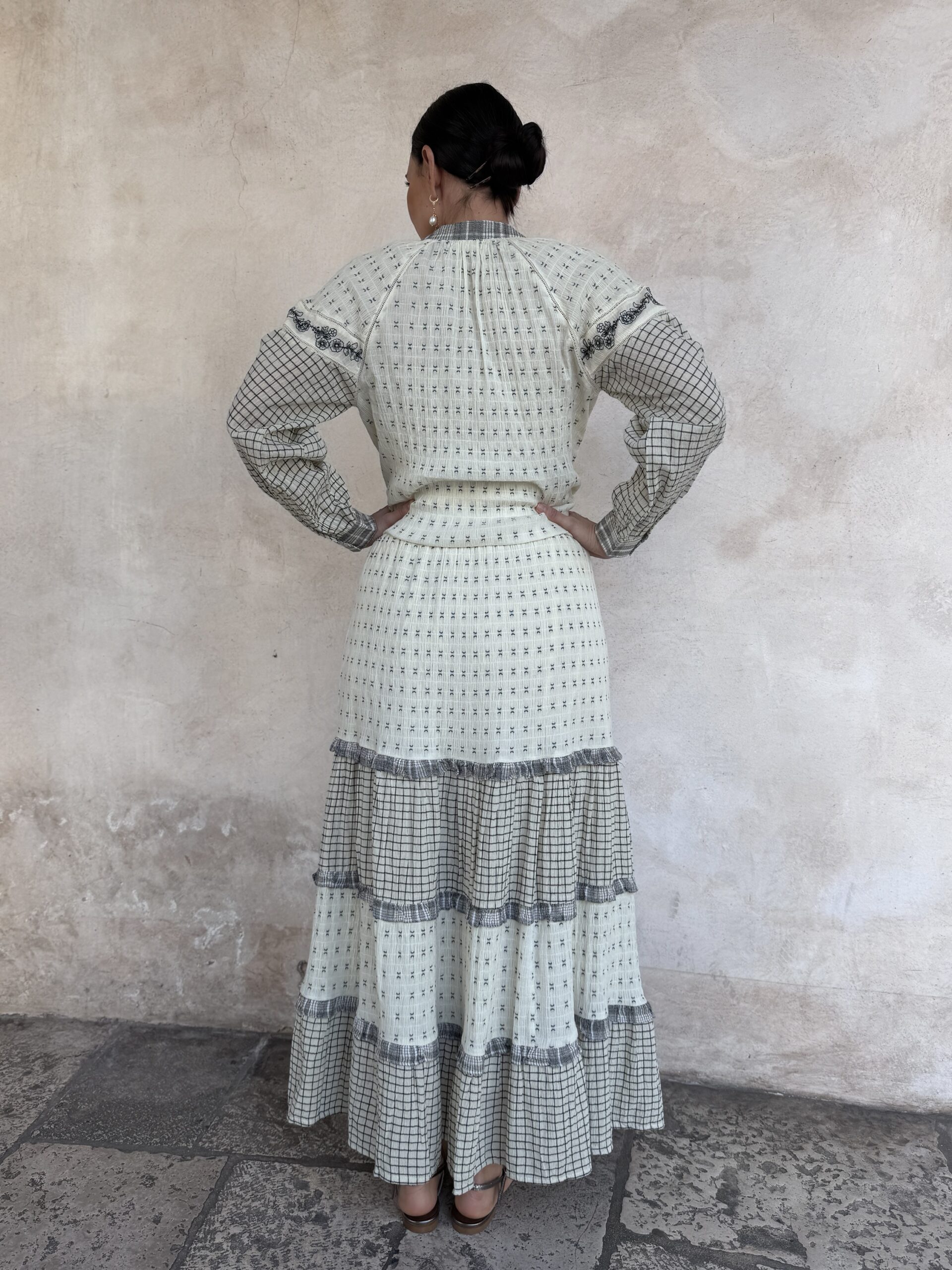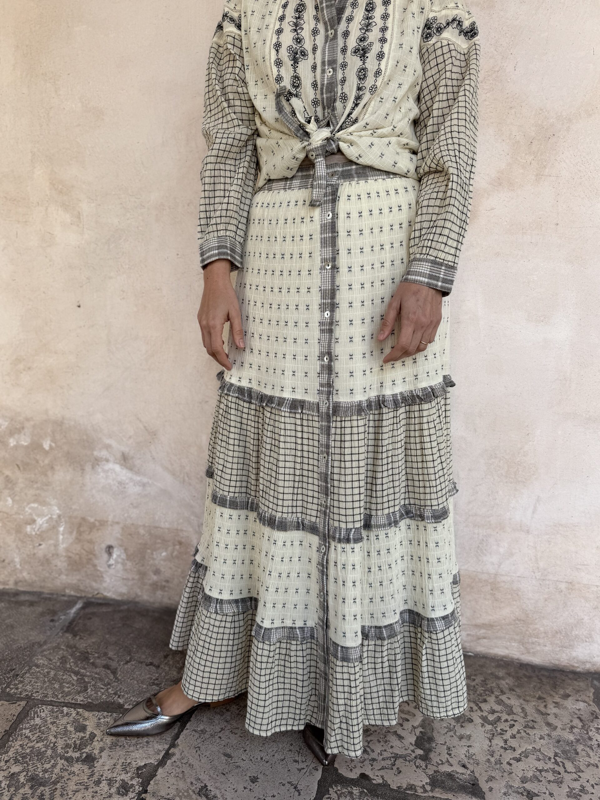 – Gonna lunga a balze in tessuto operato e ricamato.